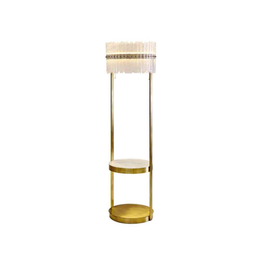 Mosiężna lampa podłogowa Josephine z podwójnym włącznikiem i podświetlaną marmurową tacą z ozdobnymi szklanymi elementami. Wymiary: wys.169xśr.49 cm