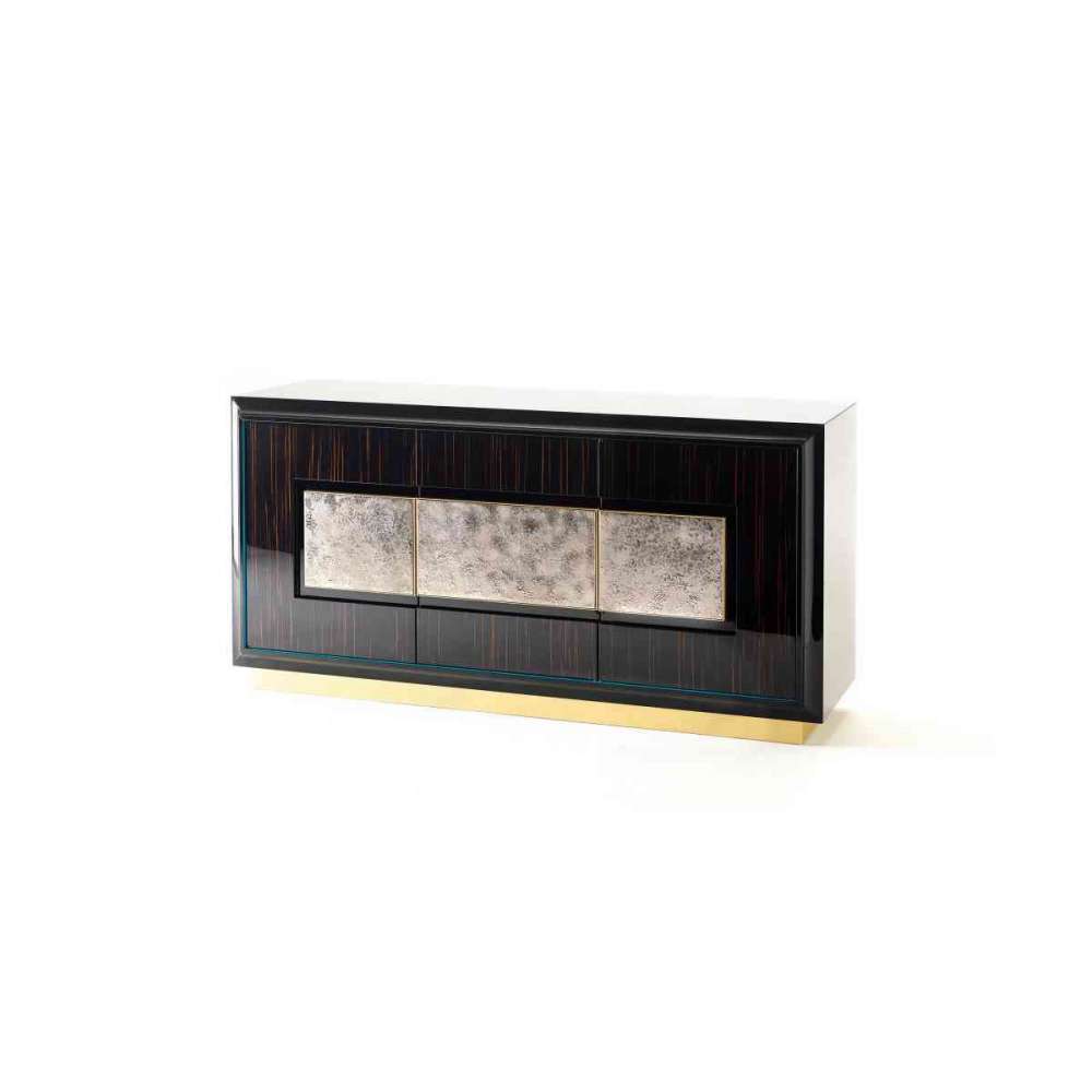 Trzydrzwiowy kredens Herbert z fornirowanego drewna z płytkami ceramicznymi osadzonymi w mosiężnej ramie. Lakierowane wewnętrznie w jednolitym i żywym kolorze z wyjątkowo przezroczystymi szklanymi półkami. Wyposażony w metalową laminowaną podstawę, jest dostępny w różnych kombinacjach wykończeń i szkliw. Wymiary: wys.80x168x50 cm
