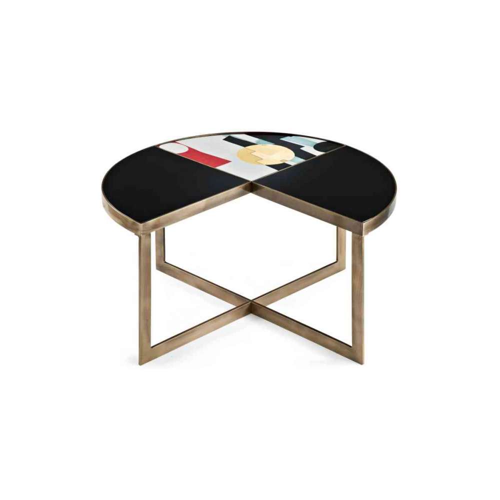 Stolik kawowy z karuzelą o mosiężnej konstrukcji i szkliwionej ceramice/szklanych elementach wpuszczanych w blat. Dostępne w różnych kombinacjach materiałów. Wymiary: wys.45x90x90 cm