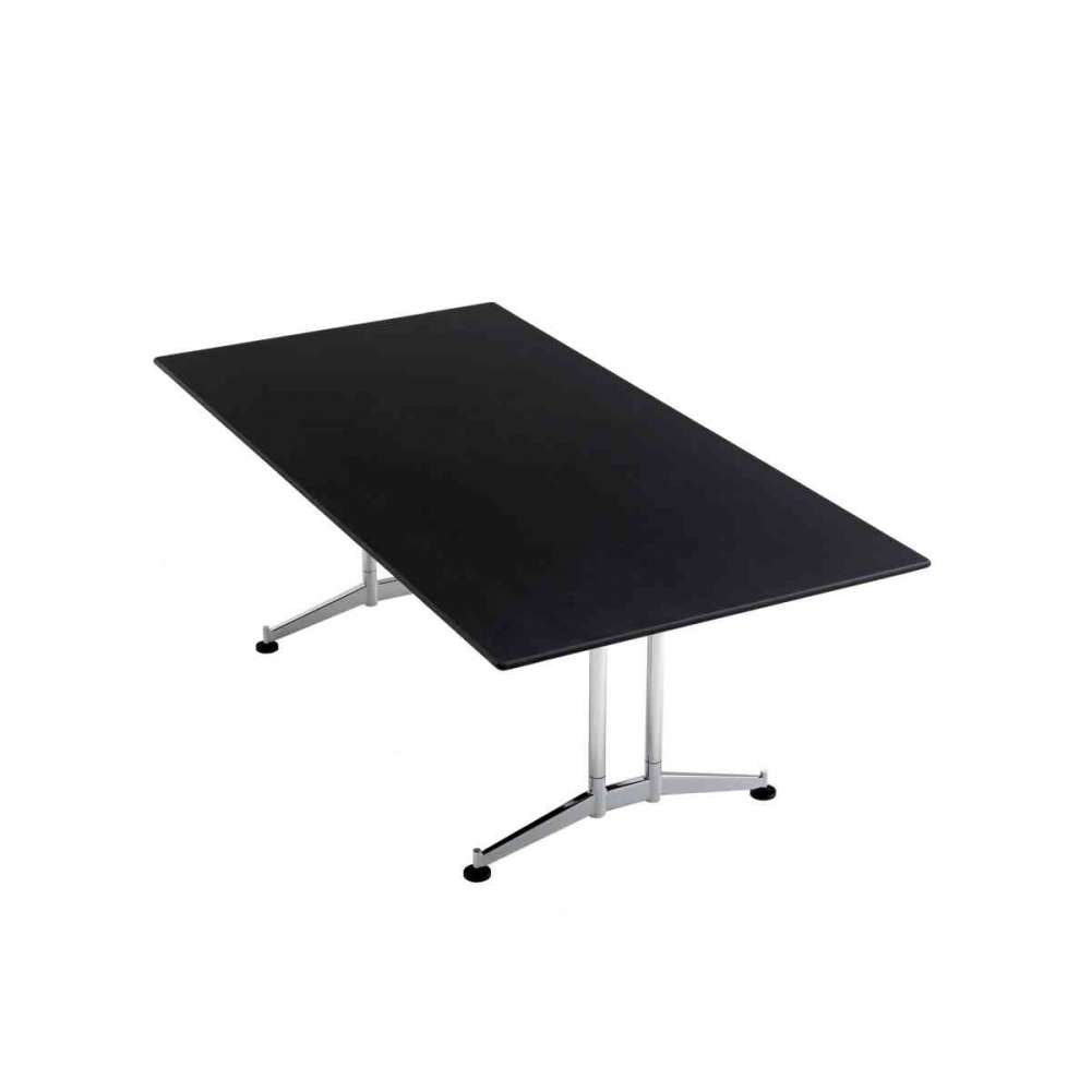 BLATY: Powierzchnia z linoleum, laminatu lub drewna – prosta krawędź ABS lub fazowane obrzeża drewniane: lity dąb. PODSTAWA: Poprzeczna stopa w jasnym chromie, pionowe rurki w jasnym chromie lub czarnym ziarnistym lakierze. Stoły kontaktowe są wyposażone w kółka z regulacją wysokości. AKCESORIA: wspornik przedłużający, nasadka do zarządzania przewodami i taca oraz panel skromności.