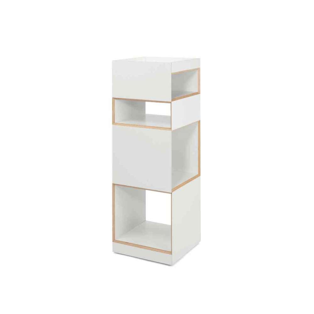 Regał o wielu zastosowaniach: HENRY w czerni i bieli, mały, średni i duży może być obiektowym punktem centralnym w pokoju lub najbardziej dyskretnym meblem. HENRY jest wolny, autonomiczny i dostępny ze wszystkich stron jako przegroda pokoju lub jako mebel uzupełniający w łazience, salonie czy przedpokoju. Łatwe przesuwanie dzięki swobodnie obracającym się ukrytym rolkom. Dzieląca wkładka do półki i szuflada – obie wykonane z blachy stalowej i pomalowane na niebiesko lub biało – uzupełniają HENRY i rozszerzają jego funkcję. Produkty MAGAZYNOWE. W przypadku HENRY oprócz funkcjonalności ten niewielki mebel zachwyca wyrafinowanym designem: panele frezowane pod kątem 45 stopni łączą się naprzemiennie w wysokości. Daje to HENRY wyjątkowo delikatny ogólny zarys i jednocześnie podkreśla wysoką jakość materiału poprzez uwidocznienie laminowanego drewnianego rdzenia. HENRY jest dostarczany w pełni zmontowany. HENRY'EGO i projektantów Studio Sergeant odkryliśmy wokół młodego Belga Pietera van den Poela na wystawie prac absolwentów „Thomas More Hogeschool Mechelen”. Poprzez nazwę swojego mebla młodzi projektanci chcą przypomnieć nam architekta Henry'ego van der Velde, który zbudował imponującą wieżę w swoim rodzinnym mieście Ghent: architektura budynku biblioteki „Boekentoren” przypomina stos książek.