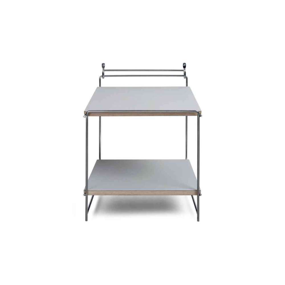 Stabilna konstrukcja z drutu stalowego wspiera dwa panele intarsjowane z pokryciem linoleum. Możesz wybierać spośród trzech wariantów materiałowych i kolorystycznych. Z jednej strony oferujemy ramę malowaną proszkowo na jasnoczerwono lub czarno w połączeniu z szarymi panelami drewnianymi pokrytymi ciemnoszarym linoleum, a po drugie chromowaną ramę w połączeniu z jasnoszarym linoleum na panelach ze sklejki z atrakcyjnymi drewnianymi krawędziami ze wszystkich stron.