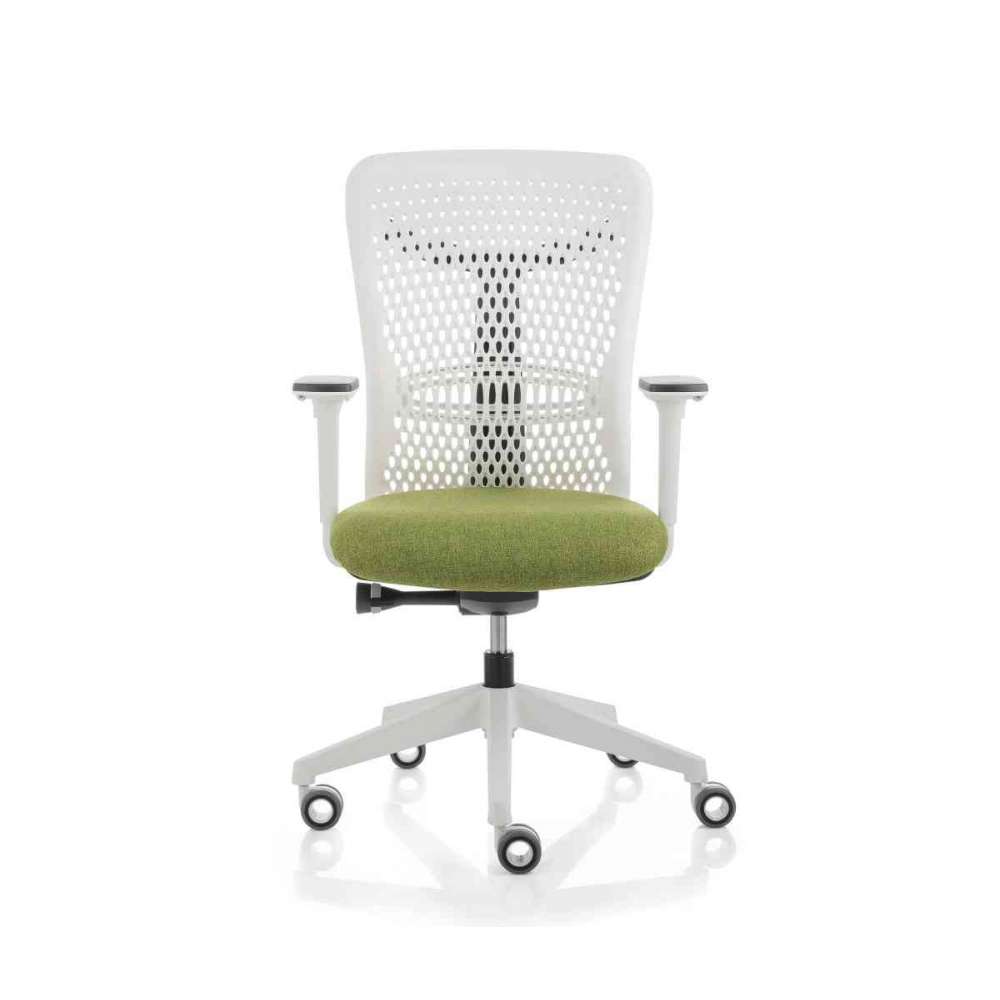 Krzesło biurowe, czarne lub białe wysokie oparcie z czarną strukturą, regulowane podparcie odcinka lędźwiowego, synchronizacja z przesuwanym siedziskiem, regulowane podłokietniki 2D, podstawa z polerowanego aluminium z czarnymi kółkami Ø 65 mm lub biała lub czarna podstawa nylonowa z czarnymi lub białymi kółkami Ø 50 mm, czarny lub biały plastik
