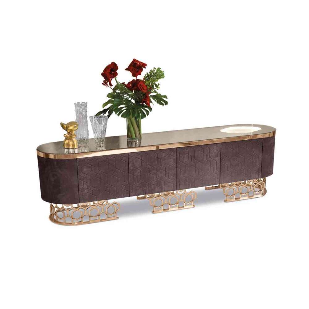 Szafka do salonu pokryta w całości skórą z kategorii w asortymencie. Wykończenie wewnętrzne z bejcowanego na ciemno drewna zebrano. Podstawa z kalandrowanego, laserowo wycinanego szlifowanego metalu z dekoracją „Sequence” w następujących wykończeniach: jasne jasne złoto, matowe szampańskie złoto, jasny chrom, jasny czarny chrom, matowy satynowy brąz. Krawędzie ze szlifowanego metalu w takim samym wykończeniu jak podstawa. Opcjonalnie: istnieje możliwość wstawienia tylko jednej półki marmurowej z dyfuzorem świetlnym i szklanym. Pokrycie 3D drzwi wypukłym dekorem „Diament” lub „Sekwencja” jest możliwe tylko w przypadku skóry P.3 Kat. Suede i Lusso. Wykończenie półek: brąz lub przydymione lustro 5 mm z fazowaną krawędzią. Marmur o grubości 20 mm ze skosem mm 20: marmur Port Saint Laurent, marmur Rosso Levanto, marmur Bardiglio Nuvolato, marmur Elegant Brown, marmur Shale Rosewood, marmur Emperador Dark, marmur Silver Wave, marmur Port Black, marmur Frappuccino, marmur Calacatta Gold.