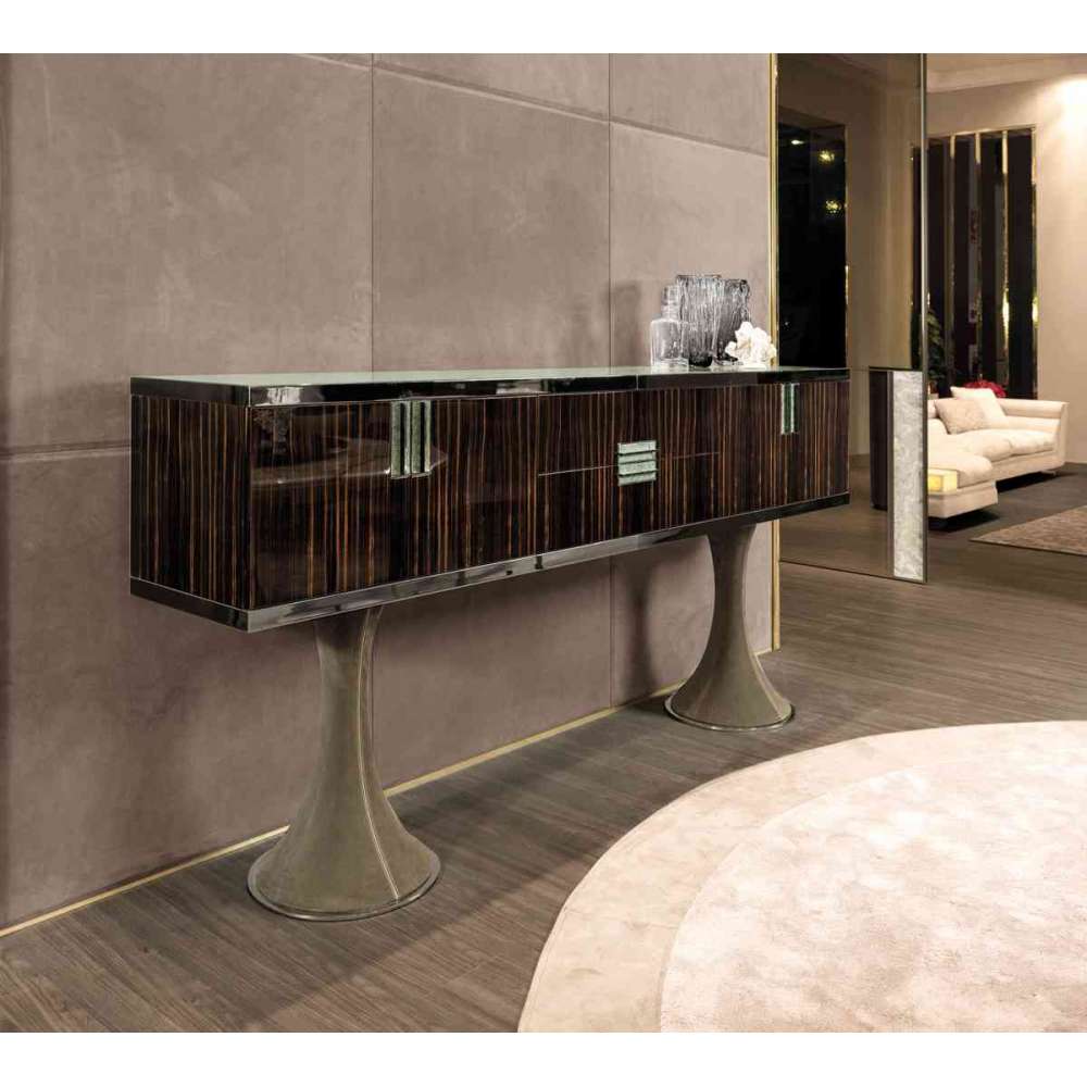F - Kredens: Szafka z bokami i drzwiami ze szkła hartowanego z brązu (tył szafki z lakierowanego drewna). Centralne drzwi klapowe pokryte skórami gamy. Wnętrze drzwi klapowych pokryte skórą zamszową P.3. Wnętrze w neutralnym lustrze, środkowa półka z przezroczystego hartowanego szkła z brązu 8mm. Oświetlenie za pomocą ściemnianej taśmy LED. Dotykowy włącznik włącza światło. Wykończenia blatów: - brąz 4 mm lub przydymione lustro z fazą. Uchwyty z metalu z wkładką z marmuru z tej serii. Krawędzie i podstawa z metalu w wykończeniach: jasne jasne złoto, matowe szampańskie złoto, jasny chrom, jasny czarny chrom, matowy satynowy brąz, jasne różowe złoto, matowe różowe złoto.