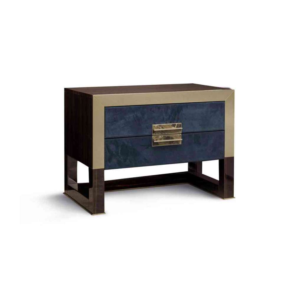 Komoda z 4 szufladami i stolik nocny z 2 szufladami. Nogi i stelaż pokryte skórą, aksamitem lub kaszmirem Loro Piana Wnętrza z gamy lub drewno: heban połysk/mat, orzech Canaletto połysk/mat, kość słoniowa lakierowana na połysk. Profil podstawy i gzymsu ze szlifowanego metalu w wykończeniach: jasne jasne złoto, matowe szampańskie złoto, jasny chrom, jasny czarny chrom, matowy satynowy brąz. Górne wykończenie: brąz lub przydymione lustro, szkło malowane na czarno, błyszczący/matowy heban, błyszczący/matowy orzech Canaletto, błyszcząca lakierowana kość słoniowa