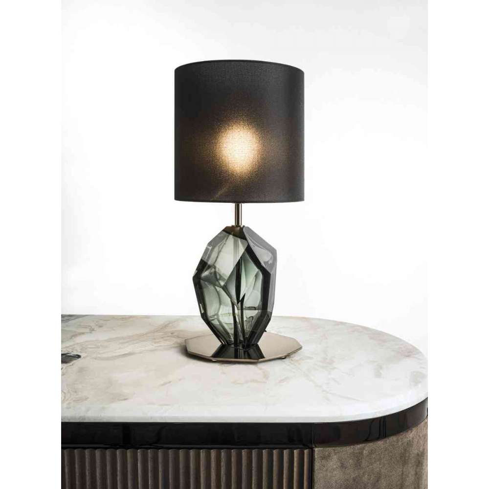 Lampa stołowa z dmuchanym i ręcznie fazowanym szklanym wspornikiem w kolorach przydymionej szarości, bursztynu i białej multibubble, z metalową konstrukcją w galwanicznych wykończeniach jasnego złota i czarnego niklu. Cylindryczny abażur z czarnej tkaniny. Standardowa instalacja elektryczna 230V, 50Hz - E27. Opcjonalna instalacja elektryczna 120V, 60Hz - E26.