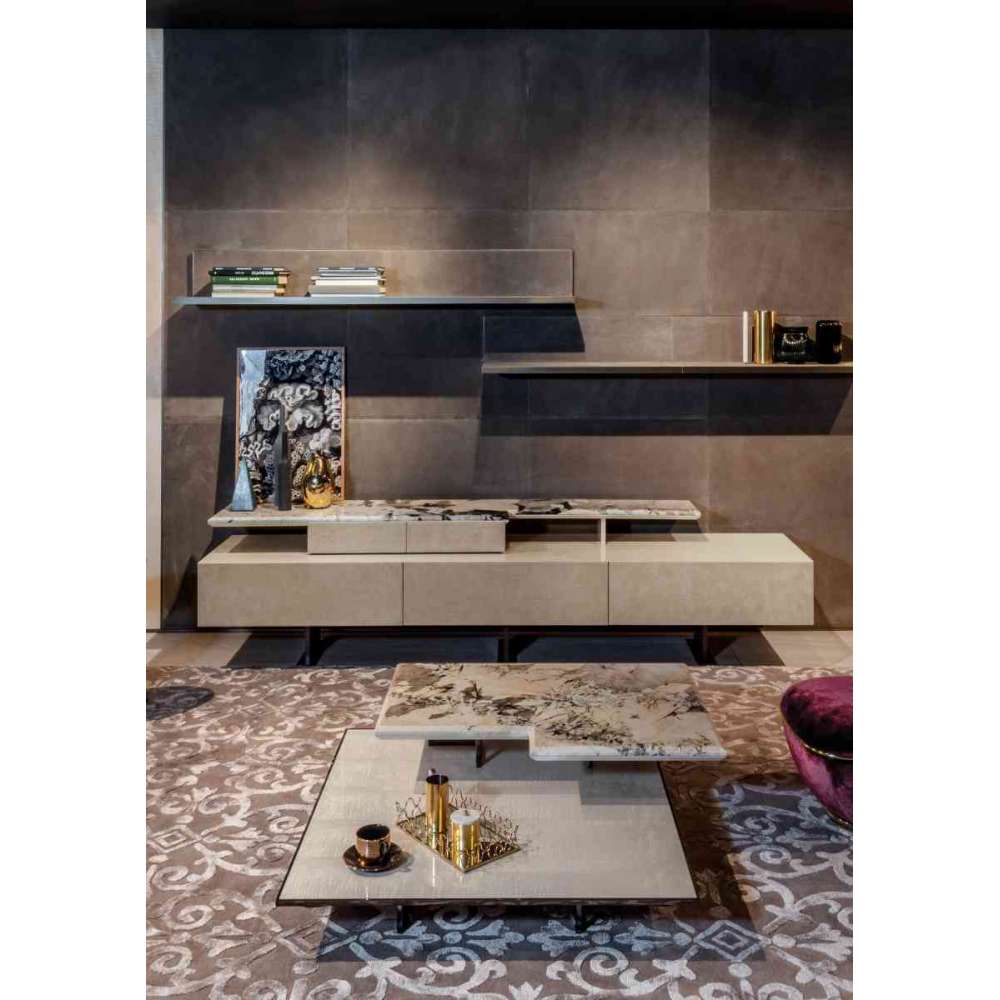 Podstawa z aluminium malowanego na brąz. Boki i blat z drewna: błyszcząca kość słoniowa Sycamore frisè, błyszczący heban, błyszczący orzech Canaletto, błyszczące drewno czeczoty lub błyszczące drewno lakierowane w kolorach z gamy. Drzwi i fronty szuflad tapicerowane skórami z katalogu. Otwarcie push-pull. Wnętrza lakierowane w kolorze matowego brązu. W przypadku wykończenia Sycamore frisè wewnętrzna struktura jest lakierowana w kolorze matowej kości słoniowej.