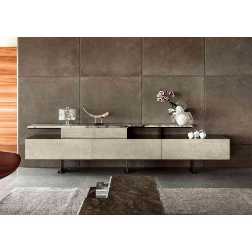 Podstawa z aluminium malowanego na brąz. Boki i blat z drewna: błyszcząca kość słoniowa Sycamore frisè, błyszczący heban, błyszczący orzech Canaletto, błyszczące drewno czeczoty lub błyszczące drewno lakierowane w kolorach z gamy. Drzwi i fronty szuflad tapicerowane skórami z katalogu. Otwarcie push-pull. Wnętrza lakierowane w kolorze matowego brązu. W przypadku wykończenia Sycamore frisè wewnętrzna struktura jest lakierowana w kolorze matowej kości słoniowej.