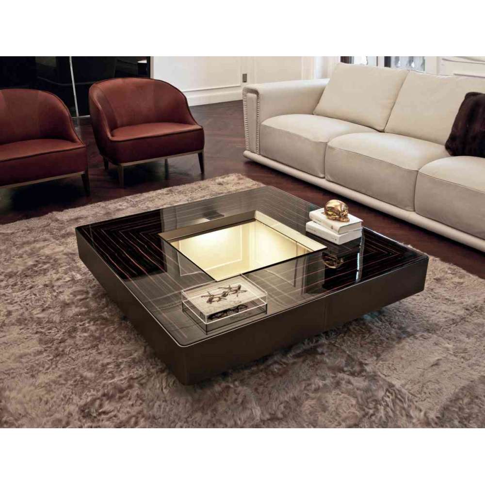 Stół z centralną tacą pokrytą brązem i przydymionym lustrem. Wykończenie wierzchu: błyszczący heban, błyszczący orzech Canaletto, matowy heban, matowy orzech Canaletto, błyszcząca lakierowana kość słoniowa, matowe Wenge, pokryte skórą w kolorach z katalogu. Listwa zewnętrzna pokryta pikowaną skórą w kolorze kat. P.3 Zamsz lub Lusso lub kot. P.9 Nabuck lub listwa zewnętrzna ze szlifowanego metalu w wykończeniach: jasne jasne złoto, szampańskie matowe złoto, jasny chrom, jasny czarny chrom, matowy satynowy brąz.
