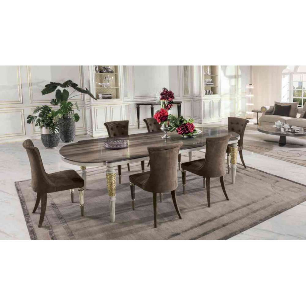 Stół z profilowanym blatem w wykończeniach: matowy heban z intarsją, marmur o grubości 20 mm z zaokrągloną krawędzią w kształcie półokrągłej krawędzi: marmur Elegant Brown, marmur Shale Rosewood, marmur Emperador Dark, marmur Silver Wave, marmur Port Black, marmur Frappuccino, marmur Calacatta Gold . Blat z metalowym brzegiem w tym samym wykończeniu co nogi lub pokryty skórą jak w naszym zestawie próbnym. Nogi z wkładką (A) dostępne w wykończeniach: wosk tracony odlany z jasnego mosiądzu, kość słoniowa onyks, marmur Elegant Brown, marmur Shale Rosewood, marmur Silver Wave, marmur Port Black, marmur Calacatta Gold, pokryte skórą jak w naszym zestawie próbnym. Toczone detale nóg (BC) dostępne w wykończeniach: jasne jasne złoto, matowe szampańskie złoto, jasny chrom, jasny czarny chrom, matowy satynowy brąz, pokryte katalogowymi skórami.