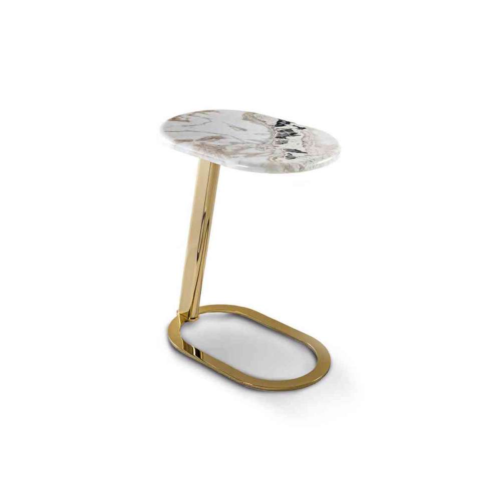 Mały stolik serwisowy z laserowo wycinaną metalową podstawą i rurową metalową kolumną w wykończeniach: