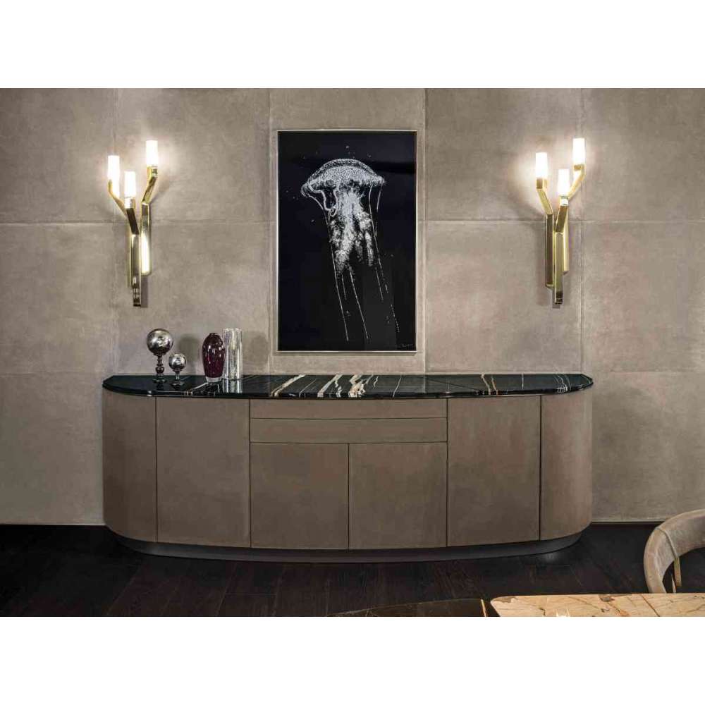 Szafka do salonu z drzwiami i szufladami z ukształtowanym blatem w różnych sekcjach z różnych materiałów. - Struktura pokryta skórami z katalogu. Otwieranie push-pull i wnętrza z ciemno bejcowanego drewna zebrano. Podstawa jest pomalowana na brąz. Blat, podzielony na 3 części, jest w wykończeniach: