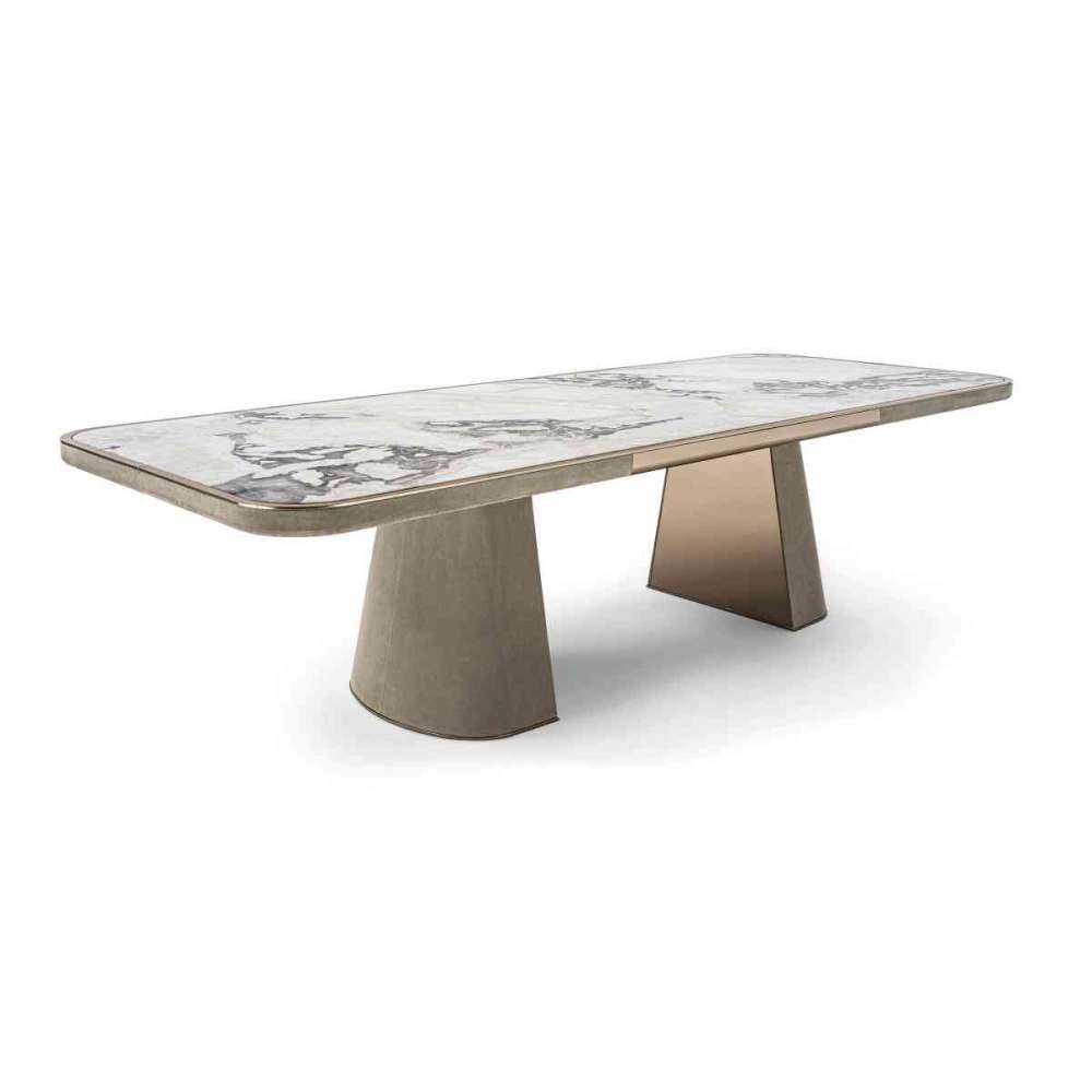 Stół z 2 nogami z włókna szklanego, pokryty zewnętrznie skórą i wewnątrz blachą w następujących wykończeniach: nikiel satynowy, jasny brąz, czarne różowe złoto, jasne jasne złoto, matowe szampańskie złoto, jasny chrom, jasny czarny chrom, matowa satyna brąz, jasne różowe złoto, matowe różowe złoto. Aby uzupełnić nogę, podstawa jest wzmocniona metalową stopą w tym samym wykończeniu co płyta. Spód pokryty katalogową skórą, podobnie jak noga, ozdobiony metalowymi wstawkami skoordynowanymi z blachą na podstawie. Blat ma obramowanie z metalu, które otacza blat, w wykończeniach: biały marmur Carrara, marmur Imperial Brown, marmur Sahara Noir (błyszczące i matowe wykończenie poliestrowe), marmur Dover White, marmur Panda White, marmur Guatemala Green, marmur Corteccia , Marmur Port Saint Laurent, Marmur Red Levanto, Marmur Bardiglio Nuvolato, Marmur Elegancki Brązowy, Marmur Shale Rosewood, Marmur Emperador Dark, Marmur Silver Wave, Marmur Agatha Black, Marmur Frappuccino, Marmur Calacatta, Marmur Fusion Light, Marmur Patagonia, Eksplozja Niebieski marmur , Marmur Fusion Multicolor, Marmur Juliet Quartz. Lazy susan (cm Ø 75-90-110) jest dostępny do ustawienia na blacie, w wykończeniach: błyszczące lakierowane drewno w gamie kolorów, błyszczący/matowy klon, błyszczący/matowy eukaliptus poddany obróbce cieplnej, błyszczący/matowy Sycamore frisè, błyszczący/matowy Heban, błyszczący/matowy Orzech Canaletto, Orzech błyszczący Orzech czeczoty lub marmur w odmianach wymienionych w katalogu.
