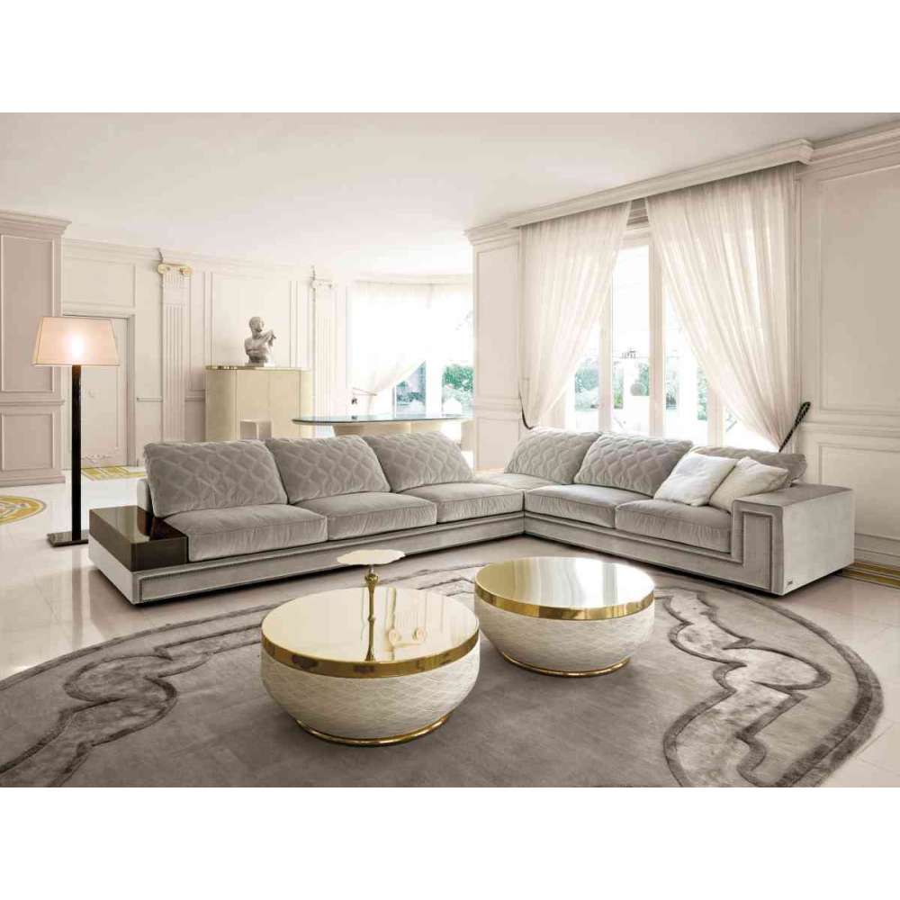 Rama z drewna z elastycznymi paskami, pokryta pianką poliuretanową o dużej gęstości. Poduszki siedziska i oparcia ze sterylizowanego puchu gęsiego, z wkładką z pianki poliuretanowej o średniej gęstości. Oparcie może być pikowane we wzór rombu (oparcie występuje w wersji z pikowaniem lub bez). Kołki na ramie są metalowe w wykończeniu czarnym, polerowanym chromem, złotem, postarzanym złotem lub pokryte jednolitym kolorem. Element dostępny z niskim podłokietnikiem w wariantach podświetlanego onyksu i polerowanego hebanu. Nogi wykonane są z drewna z malowanym wykończeniem wenge. Ze względu na specjalny proces produkcyjny tapicerki materiałowej lub skórzanej nie można zdjąć. Sofa o zmniejszonej głębokości (100 cm).