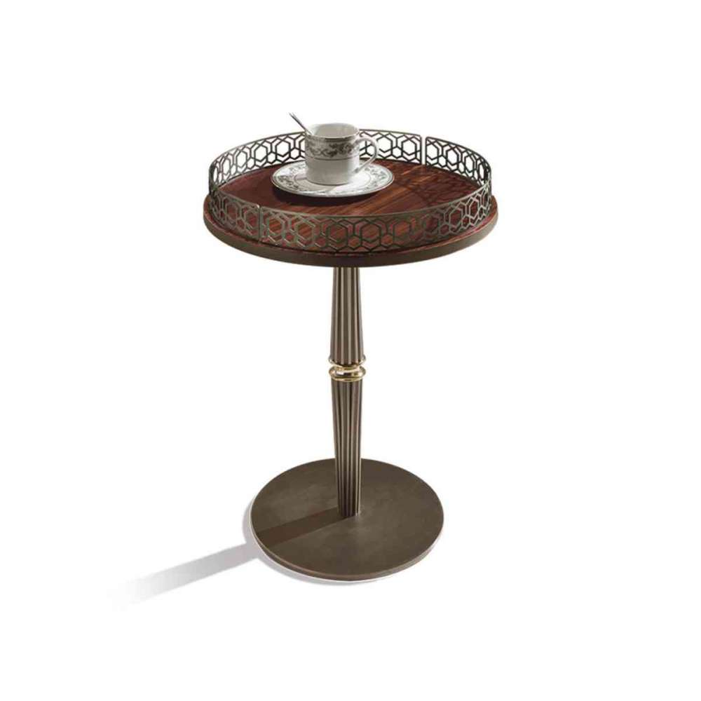 Stoliki dostępne w dwóch wersjach z różnymi blatami. 1 - z wyprofilowanym blatem z marmuru o grubości 20 mm: marmur Elegant Brown, marmur Shale Rosewood, marmur Emperador Dark, marmur Silver Wave, marmur Port Black, marmur Frappuccino, marmur Calacatta Gold. 2 - z blatem z matowego hebanu, matowego orzecha Canaletto lub pokrytym skórą, jak w naszym zestawie próbnym, z okrągłą metalową ramą z wycinaną laserowo dekoracją „Sequence” w następujących wykończeniach: jasne jasne złoto, matowe szampańskie złoto, jasny chrom, jasna czerń chrom, matowy satynowany brąz. Kolumna środkowa dostępna w trzech wariantach: 1 - w całości metalowa, jak podstawa, 2 - w całości pokryta skórą, jak w naszym próbniku, 3 - w całości pokryta skórą, jak w naszym próbniku, z metalowym pierścieniem skórzanym w tym samym wykończeniu co kolumna baza. Okrągła podstawa dostępna w wykończeniach: jasne jasne złoto, matowe szampańskie złoto, jasny chrom, jasny czarny chrom, matowy satynowy brąz, pokryte skórą jak w naszym zestawie próbek.