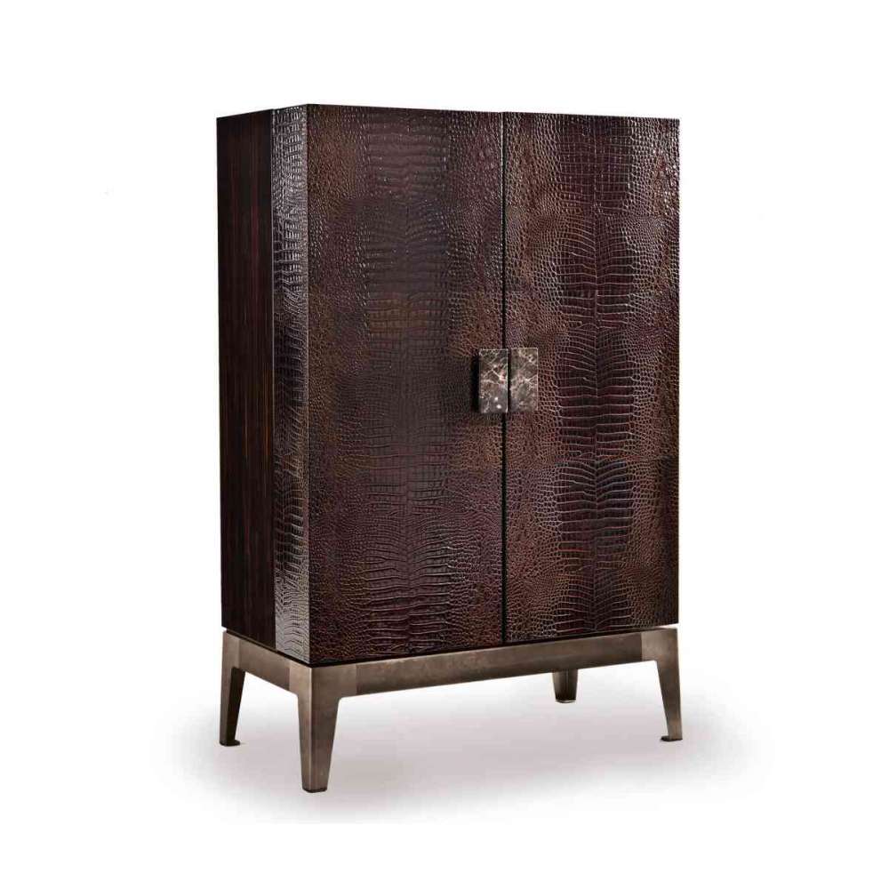 Barek z drzwiczkami schowka pokrytymi zewnętrznie skórą w kolorach katalogowych, a wewnątrz pikowaną satyną z guzikami „Swarovski”. Półki są z przezroczystego szkła. Wykończenie schowka i wnętrza szafki w drzwiach w kolorze matowego wenge, błyszczącego hebanu, matowego hebanu, błyszczącego orzecha Canaletto, matowego orzecha Canaletto lub błyszczącej lakierowanej kości słoniowej. Spód jednostki w lustrze z systemem oświetlenia led. Marmurowe uchwyty w kolorze ciemnobrązowym Emperador lub złoto-białym Calacatta. Na życzenie można wstawić lodówkę o pojemności 40 l, z drzwiami i półką z drewna w wykończeniach: Matt Wenge, błyszczący heban, matowy heban, błyszczący orzech Canaletto, matowy orzech Canaletto lub błyszcząca lakierowana kość słoniowa. Podstawa ze szlifowanego metalu w wykończeniach: jasne jasne złoto, szampańskie matowe złoto, jasny chrom, jasny czarny chrom, matowy satynowany brąz.