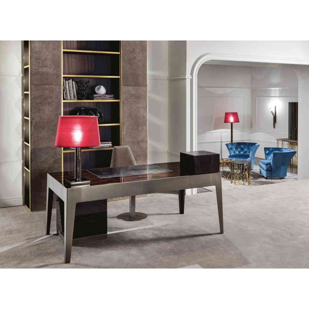 Metalowe biurko z szufladą. Wstawka ze skóry z katalogu. Wykończenia oprawek: jasne jasne złoto, szampańskie matowe złoto, jasny chrom, jasny czarny chrom, matowy satynowy brąz. Wykończenia blatów: błyszczący heban, błyszczący orzech Canaletto, matowy heban, matowy orzech Canaletto, błyszcząca lakierowana kość słoniowa. Akcesoria i opcje: komoda z błyszczącego/matowego hebanu, błyszczącego/matowego orzecha Canaletto lub błyszczącego lakieru w kolorze kości słoniowej z krawędziami w kolorze jasnego jasnego złota, jasnego chromu, jasnego czarnego chromu i matowego satynowego brązu. Fronty kryte. Minikomoda pokryta wyłącznie skórą z katalogu.
