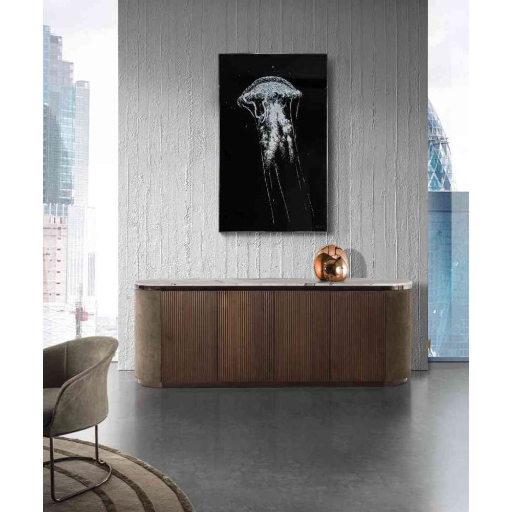 Kawałek salonu z drzwiami z litego orzecha włoskiego Canaletto z obramowaniem z efektem fali w bejcy Macadamia. Zakrzywione boki ze skóry z katalogu. Wykończenie wewnętrzne z bejcowanego na ciemno drewna zebrano. Opcjonalnie: na górze można zamontować szklany klosz z oprawą.