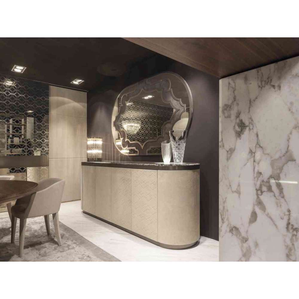 Opcjonalnie: oprawę ze szklanym dyfuzorem można zamontować tylko na marmurowym blacie. Okładzina drzwiowa z efektem 3D z wypukłym dekorem „Diament” lub „Sekwencja” jest dostępna tylko w asortymencie P.3 Suede i Lusso. Wykończenie górnej powierzchni: brąz 5 mm lub przydymione fazowane lustro. Marmur 20 mm ze skosem 20 mm: elegancki brązowy marmur, łupek z palisandru, marmur Silver Wave, marmur Port Black, marmur Frappuccino, marmur Calacatta Gold, marmur Emperador Dark. Szlifowana metalowa podstawa i krawędzie w następujących wykończeniach: jasne jasne złoto, szampańskie matowe złoto, jasny chrom, jasny czarny chrom, matowy satynowy brąz.