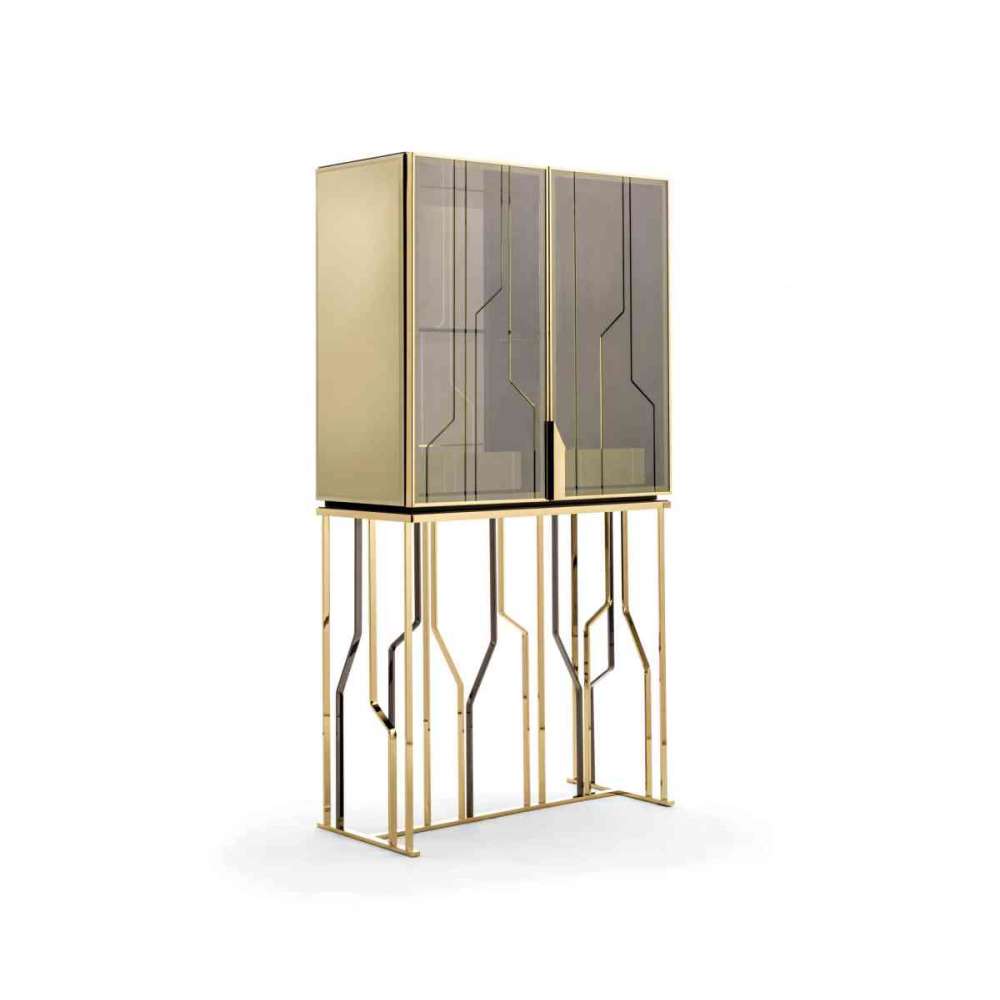 Uchwyty z metalu z wstawką z marmuru z serii. Krawędzie i płyta podstawy z metalu w wykończeniach: jasne jasne złoto, matowe szampańskie złoto, jasny chrom, jasny czarny chrom, matowy satynowy brąz. Blat z brązu lub przydymionego lustra 4 mm z fazą. C - Witryna: Szafka z bokami i drzwiami ze szkła hartowanego z brązu (tył szafki z lakierowanego drewna). Wnętrze pokryte kat. P.3 Skóra zamszowa, pojemnik wyposażony w środkową półkę z przezroczystego szkła hartowanego 8mm. Tył w neutralnym lusterku. Oświetlenie za pomocą ściemnianej taśmy LED. Dotykowy włącznik włącza światło. Uchwyty z metalu z wkładką z marmuru z tej serii. Krawędzie i płyta podstawy z metalu w wykończeniach: jasne jasne złoto, matowe szampańskie złoto, jasny chrom, jasny czarny chrom, matowy satynowy brąz. Blat z brązu lub przydymionego lustra 4 mm z fazą.