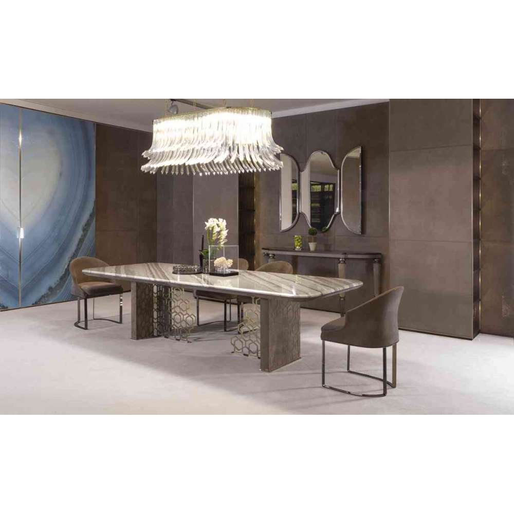 Stół z podstawą wykonaną z zewnętrznej strony z drewna tapicerowanego i pikowanego z pionowym ściągaczem lub dekoracją 3D „Sequence” ze skóry zamszowej P3, z wewnętrzną częścią obrabianą ze szlifowanego metalu i wycinaną laserowo dekoracją „Sequence” w wykończeniach: