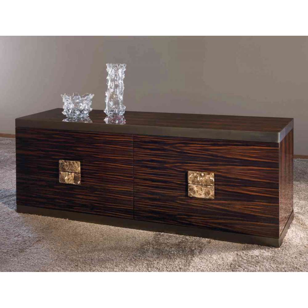 Drewniana komoda z 4 szufladami w wykończeniach: błyszczący heban, matowe Wenge, błyszczący orzech Canaletto, błyszcząca lakierowana kość słoniowa. Fronty szuflad pokryte drewnem. Żelazny gzyms na podstawie i górze to szlifowany metal, w wykończeniach: jasne jasne złoto, matowy satynowy brąz, jasny czarny chrom. Rękojeść z marmuru Emperador Dark lub Calacatta Gold. Wersja całkowicie pokryta skórą (w tym panele boczne) z marmurowym blatem: marmur Calacatta Gold, marmur Frappuccino, marmur Port Black, marmur Silver Wave, ciemny marmur Emperador.