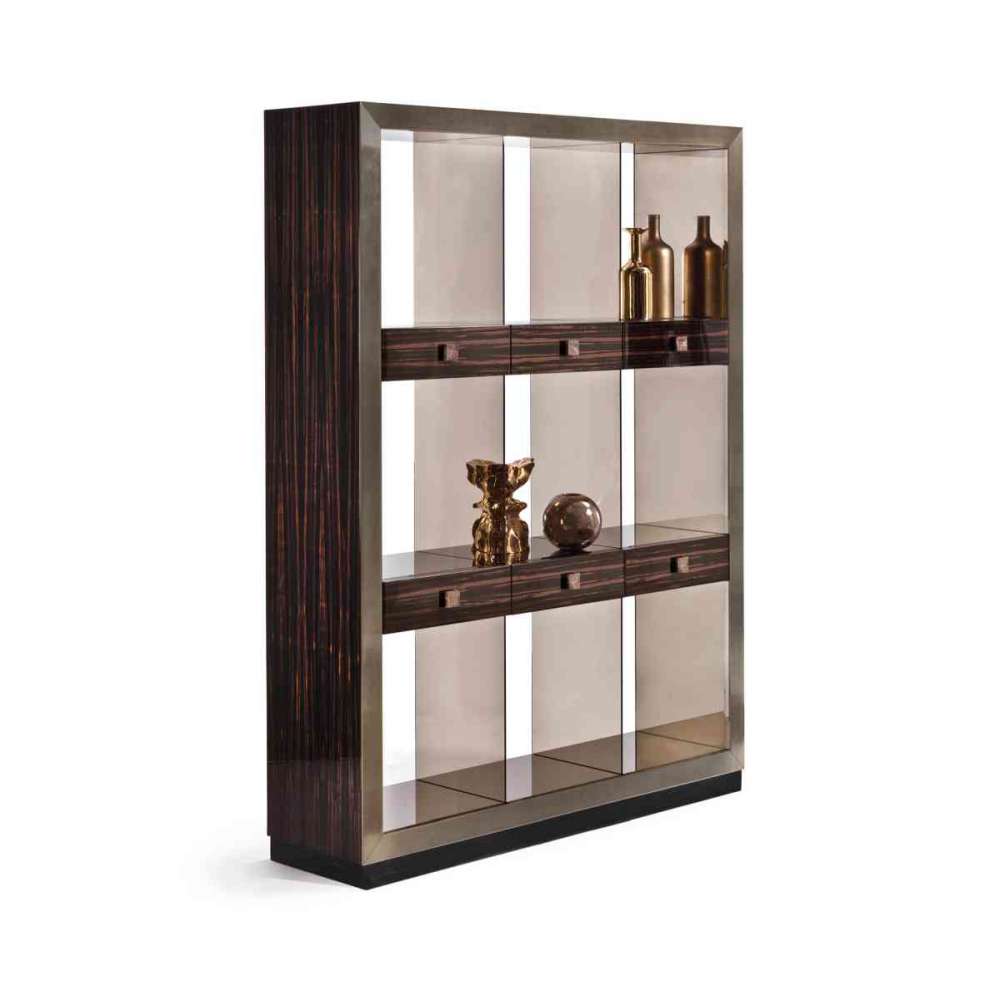Wysoka szafka z sześcioma szufladami dostępna z panelem tylnym lub otwarta, bez panelu tylnego. Wnętrze pokryte fazowanym lustrem z brązu lub dymu. Wykończenie zewnętrzne: błyszczący heban, błyszczący orzech Canaletto, błyszcząca lakierowana kość słoniowa, matowe Wenge. Marmurowe uchwyty, Emerador Dark lub Calacatta Gold. Przednia krawędź ze szlifowanego metalu w następujących wykończeniach: jasne jasne złoto, szampańskie matowe złoto, jasny chrom, jasny czarny chrom, matowy satynowy brąz.