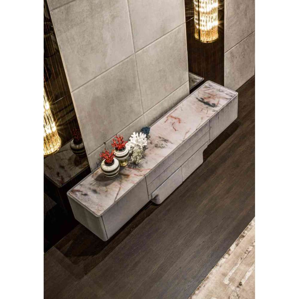 Szafka do salonu z ręcznie formowaną podstawą z włókna szklanego pokrytą skórą z katalogu. Listwa metalowa szlifowana i krawędzie w następujących wykończeniach: