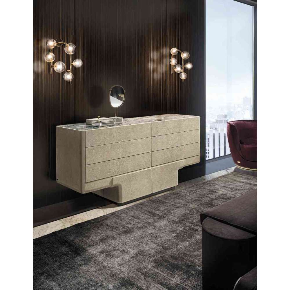Komoda z 6 szufladami z ręcznie formowaną podstawą z włókna szklanego. Listwa ze szlifowaną metalową krawędzią w następujących wykończeniach:
