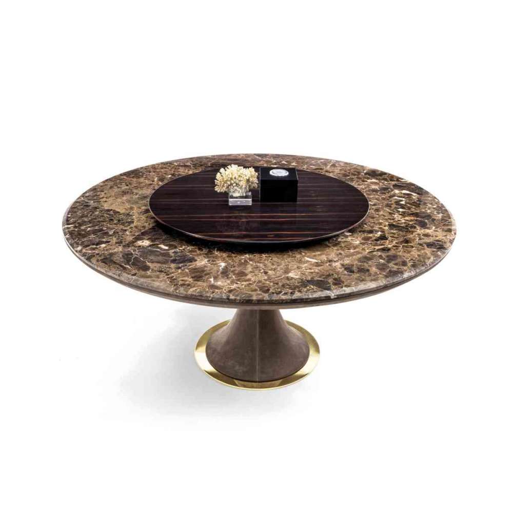 Okrągły stół wykonany z włókna szklanego w kształcie hiperboloidy, z wewnętrzną strukturą z malowanego metalu, pokryty skórą z gamy z metalową płytą podstawy w wykończeniach: jasne jasne złoto, matowe szampańskie złoto, jasny chrom, jasny czarny chrom, matowa satyna brązowy. Górne wykończenia: malowany czarny kryształ 10 mm z fazowaniem, brąz lub przydymione lustro 5 mm z fazowaniem, marmur o grubości 20 mm, z fazą 20 mm w: Marmur Gwatemala Zielony, Marmur Corteccia, Marmur Port Saint Laurent, Marmur Red Levanto, Marmur Bardiglio Nuvolato , Elegancki brązowy marmur, marmur Shale Rosewood, marmur Emperador Dark, marmur Silver Wave, marmur Agatha Black, marmur Frappuccino, marmur Calacatta Gold. Podeszwa pokryta skórą z serii, skoordynowana z podstawą. Obrotowa taca do postawienia na blacie jest dostępna w wykończeniach: drewno lakierowane błyszczące w gamie kolorystycznej, heban błyszczący/matowy, orzech Canaletto błyszczący/matowy, Sucupira Luxury błyszczący, orzech orzechowy błyszczący, marmur w tych samych wersjach co blat szczyt.