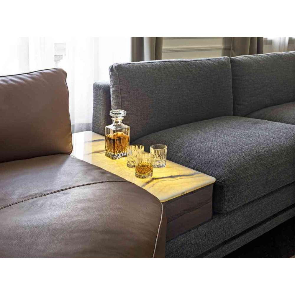 Kolekcja obejmuje dwa rodzaje podłokietników: wysoki wyściełany podłokietnik z pikowanym wzorem w paski lub niski metalowy w wykończeniach serii Longhi i półkę użytkową z podświetlanego, ściemnianego onyksu lub marmuru. Kolejną cechą jest modułowość: wszechstronne elementy narożne umożliwiają oferowanie szerokiej gamy kompozycji. Otwarte narożniki mogą być stosowane w kompozycjach narożnych lub jako pojedyncze szezlongi. Kolekcję uzupełniają różne typy małych stolików do określonych zastosowań: pokryte skórą lub tkaniną, z blatami z marmuru, drewna lub lustra w szerokiej gamie kolorystycznej, z możliwością wstawienia praktycznego przedziału barowego lub schowka z drzwiczkami na prostokątnej jednostce. Konstrukcja sofy wykonana jest z drewna z elastycznymi taśmami o wysokiej wytrzymałości, pokrytymi pianką poliuretanową o dużej gęstości. Poduszki siedziska pokryte są sterylizowanym gęsim puchem, z wkładkami z pianki poliuretanowej o różnej gęstości, z zaokrągloną powierzchnią z pianki Memory Foam, która zapewnia lepszą odporność na zgniatanie w miarę upływu czasu. Poduszki oparciowe wykonane są z MULTIFILL, specjalnej mieszanki miękkiego sterylizowanego puchu gęsiego w połączeniu z syntetyczną breją Rollo II i wiórkami pianki poliuretanowej, które sprawiają, że poduszka jest miękka i wygodna, zapobiegając efektowi zgniecenia typowego dla poduszek wypełnionych puchem. Metalowe obramowanie podstawy sofy jest dostępne w następujących wykończeniach: jasne jasne złoto, matowe szampańskie złoto, jasny chrom, jasny czarny chrom, matowy satynowy brąz.