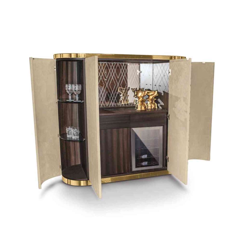 Szafka barowa w całości pokryta skórą z przykładowego katalogu. Wykończenie wnętrza drewnem zebrano bejcowane na ciemno, półki z przezroczystego szkła, laserowo podświetlane lustro z dekoracją, dwie szuflady i opcjonalna mini lodówka na wino. Okładzina drzwiowa z efektem 3D z wypukłym dekorem „Diament” lub „Sekwencja” jest dostępna tylko w asortymencie P.3 Suede i Lusso. Wykończenie górnej powierzchni: brąz 5 mm lub przydymione fazowane lustro. Szlifowana metalowa podstawa i krawędzie w następujących wykończeniach: jasne jasne złoto, szampańskie matowe złoto, jasny chrom, jasny czarny chrom, matowy satynowy brąz.