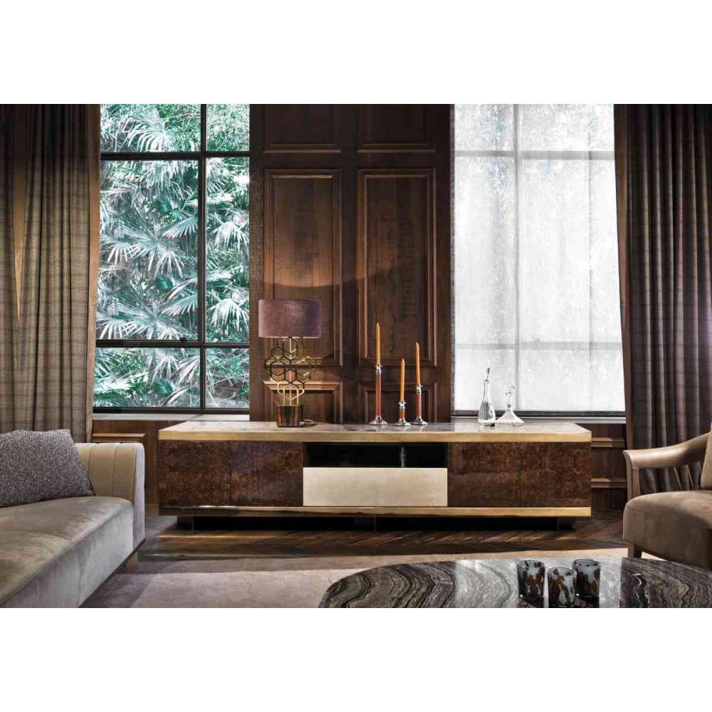Niska szafka do salonu z drzwiami i szufladami. Poniżej dostępne wersje: A - drewno lite, B - stelaż drewniany z blatem marmurowym lub lustrzanym, C - boki i blat drewniany z frontem pokrytym skórą z naszej oferty lub z lustrem, D - tapicerowane w całości skórą z naszej oferty z marmurem , blat drewniany lub lustrzany, E - Boki drewniane, blat marmurowy lub lustrzany, front tapicerowany skórą z naszej oferty lub front lustrzany. Szlifowane metalowe krawędzie w następujących wykończeniach: błyszczące jasne złoto, jasny chrom, błyszczący czarny chrom, matowy satynowy brąz. Drewno: błyszczący heban, matowe Wenge, lakierowana kość słoniowa z połyskiem, orzech Canaletto z połyskiem. Fazowane lustro z brązu lub dymu. Marmury: marmur Calacatta Gold, marmur Frappuccino, marmur Port Black, marmur Emperador Dark. Marmurowe uchwyty dla wersji tapicerowanej skórą, z otwieraniem push-pull dla wersji lustrzanej.
