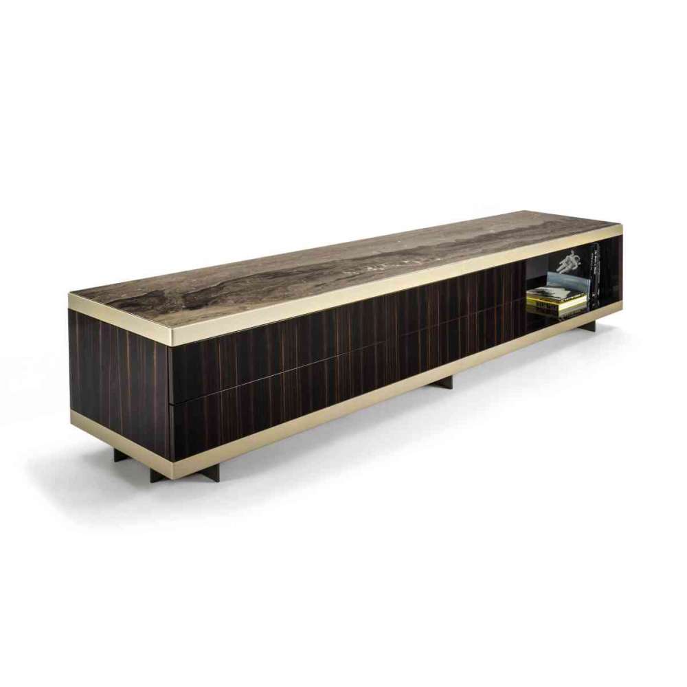 Niska szafka do salonu z drzwiami i szufladami. Poniżej dostępne wersje: A - drewno lite, B - stelaż drewniany z blatem marmurowym lub lustrzanym, C - boki i blat drewniany z frontem pokrytym skórą z naszej oferty lub z lustrem, D - tapicerowane w całości skórą z naszej oferty z marmurem , blat drewniany lub lustrzany, E - Boki drewniane, blat marmurowy lub lustrzany, front tapicerowany skórą z naszej oferty lub front lustrzany. Szlifowane metalowe krawędzie w następujących wykończeniach: błyszczące jasne złoto, jasny chrom, błyszczący czarny chrom, matowy satynowy brąz. Drewno: błyszczący heban, matowe Wenge, lakierowana kość słoniowa z połyskiem, orzech Canaletto z połyskiem. Fazowane lustro z brązu lub dymu. Marmury: marmur Calacatta Gold, marmur Frappuccino, marmur Port Black, marmur Emperador Dark. Marmurowe uchwyty dla wersji tapicerowanej skórą, z otwieraniem push-pull dla wersji lustrzanej.