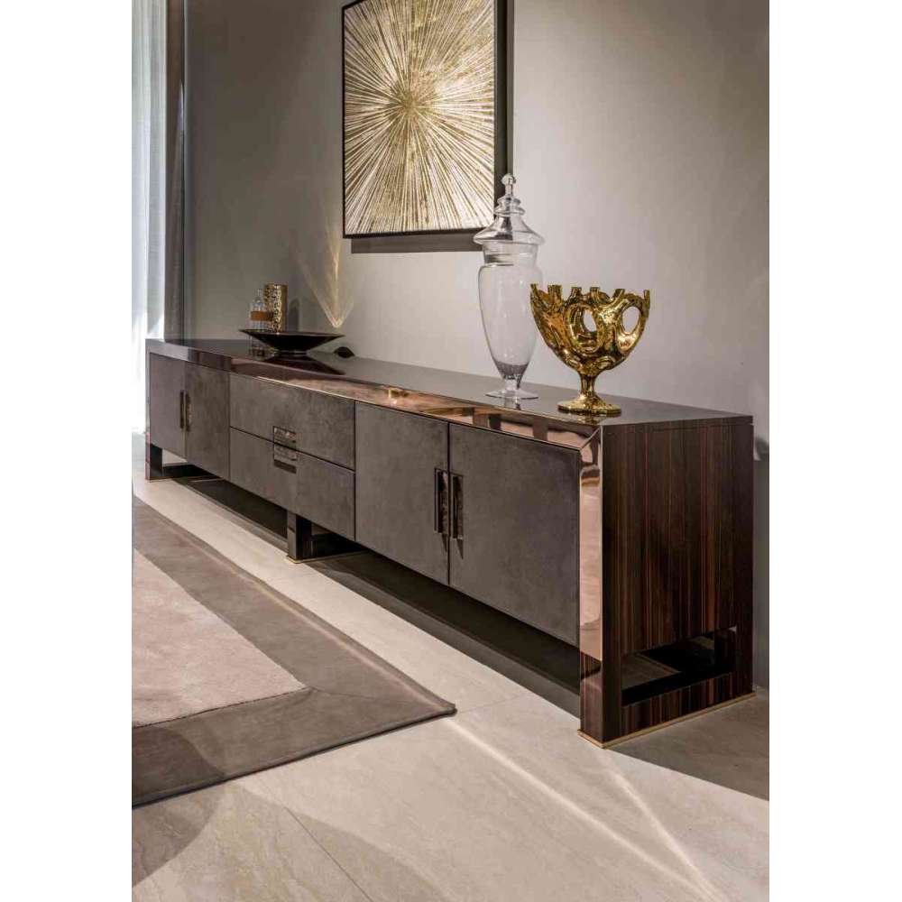Fronty szuflad pokryte skórą lub kaszmirem Loro Piana Wnętrza z gamy lub w tym samym gatunku drewna co rama.