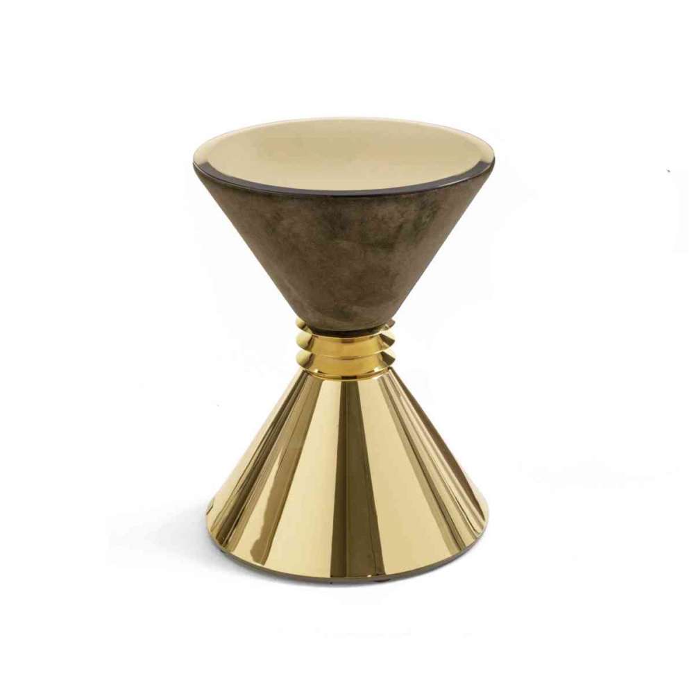 Seria małych stołów modułowych z podstawą w kształcie piramidy, dostępna w różnych rozmiarach i wykończeniach. Struktura z metalu: jasne jasne złoto, matowe szampańskie złoto, jasny chrom, jasny czarny chrom, matowy satynowy brąz, błyszczący lakier w gamie kolorystycznej, tapicerka z gamy skór Toczone metalowe elementy dystansowe: jasne jasne złoto, matowe szampańskie złoto, jasny chrom, jasna czerń chrom, matowy satynowy brąz. Tylko górna część ma metalowy element, z wkładką ze stali nierdzewnej do wykorzystania jako uchwyt na butelkę lub pojemnik na rośliny. Górne wykończenie: brąz 4 mm lub przydymione lustro z fazą, Marmur gr. 20 mm z fazą 20 mm: Marmur Gwatemala Zielony, Marmur Corteccia, Marmur Port Saint Laurent, Marmur Red Levanto, Marmur Bardiglio Nuvolato, Marmur Elegant Brown, Marmur Shale Rosewood, Emperador Ciemny marmur , Marmur Silver Wave, Marmur Agatha Black, Marmur Frappuccino, Marmur Calacatta Gold, Tylko w przypadku modelu kontenerowego blat jest metalowy w wykończeniach: jasne jasne złoto, matowe szampańskie złoto, jasny chrom, jasny czarny chrom, matowy satynowy brąz. Pufa ANGIE Mały stolik staje się stołkiem/pufą dzięki zastosowaniu poduszki pokrytej skórą z serii.