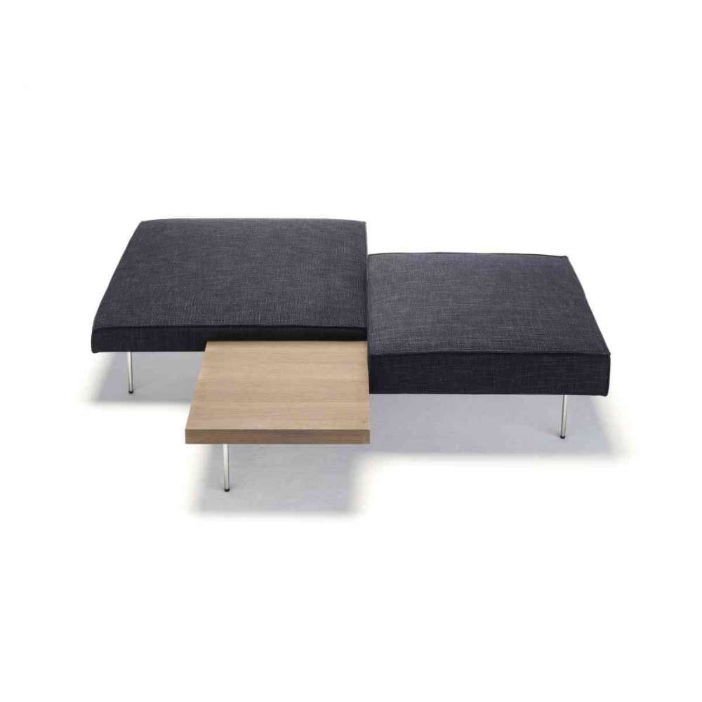 Element składający się ze stolika kawowego i dwóch elementów do siedzenia, z ramą nośną ze stali malowanej proszkowo epoksydowo. Nóżki ze stali nierdzewnej ø15mm, wykończenie mat satyna, przykręcane do podstawy za pomocą tulei. Blat z płyty MDF o grubości 20 mm fornirowanej płytami z wiązu lub dębu Thermo z wykończeniem farbą akrylową na bazie wody. Elementy siedziska z wielowarstwowej, wyściełanej pianką poliuretanową o różnej gęstości, pokrytej igłowanym, żywicowanym włóknem poliestrowym, przyklejonym do welurowego podkładu poliamidowego. Tapicerka materiałowa lub skórzana, obie w pełni odpinane za pomocą zapięcia na rzepy.