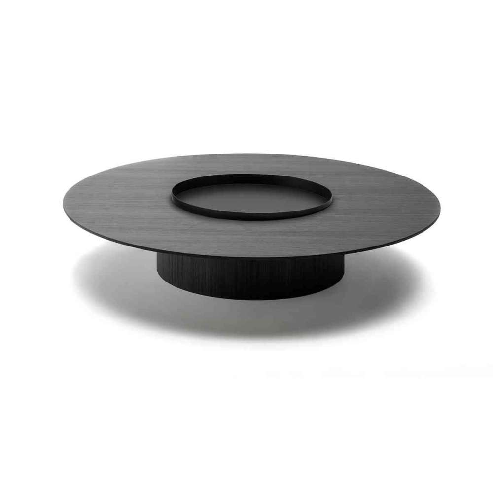 Stół z centralną otwartą komorą, składający się z blatu z MDF, Ø128 cm na zewnątrz i Ø49 cm wewnątrz, o grubości 25 mm dostępnej fornirowanej lub polerowanej, oraz podstawy - z centralną komorą - w „kanapce” z wielowarstwowej i MDF zawsze lakierowanej na mat czarny .