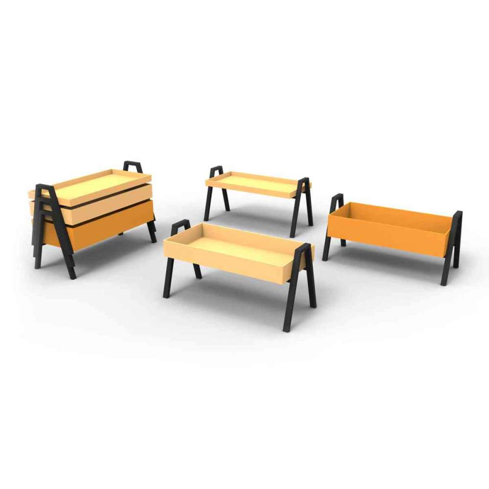 Stół składający się z 3 sztaplowanych tac o różnych wysokościach. Nogi ze sklejki brzozowej lakierowanej na czarno. Tace z lakierowanej sklejki brzozowej o grubości 6 mm, przymocowane do każdej podstawy.