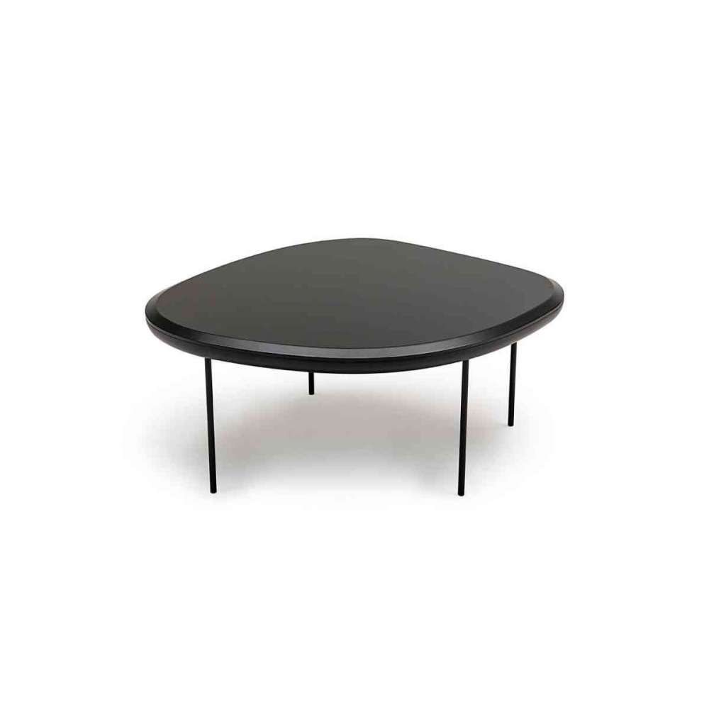 Rodzina stolików o organicznych kształtach, z monoblokowym blatem składającym się ze ściętego blatu dostępnego z MDF lakierowanego na czarny mat lub marmuru, przykręcanego do dolnej krawędzi blatu z MDF zawsze lakierowanego na czarny mat, wyposażone w tuleje mocujące do przykręcenia stalowych rurek nóżki Ř12 mm lakierowane proszkowo epoksydowo w kolorze brązowo-szarym.