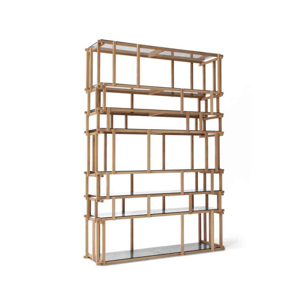 Regał wykonany z listewek z litego drewna różnej wielkości o grubości 20x20mm zmontowanych razem. Wykończenia: naturalny dąb, orzech „canaletto” lub orzech „canaletto” barwiony na węgiel drzewny i wykończony farbą akrylową na bazie wody. 6 półek z przezroczystego szkła hartowanego o grubości 6mm.