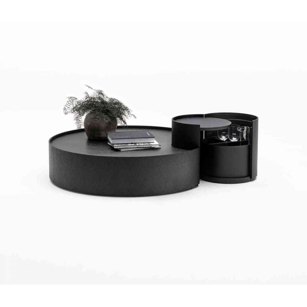 wyjmowane elementy obrotowe o różnych pojemnościach, z MDF lakierowanego na czarny mat. Moon Eclipse: stolik kawowy składający się z dwóch elementów, jednego stałego Ø105 cm wys. 25 cm, z którym łączy się drugi Ø40 cm wys. 40 cm z otwieraną częścią wyposażoną w obrotową i wyjmowaną tacę - odpowiednią do przechowywania butelek i szklanek - z kółkami. Dwie części są połączone ze sobą za pomocą zawiasu, a zamknięcie zapewniają wbudowane w konstrukcję magnesy. Moon Satellite: element o średnicy 40cm wys.57cm na kółkach, składający się z części stałej ze stabilizatorem zamocowanym wewnątrz podstawy oraz części otwieranej składającej się z dwóch przegródek o różnych wysokościach i pojemnościach, które można otworzyć maksymalnie do 90° - 100°. Dwie części (stała i otwierana) są połączone ze sobą za pomocą regulowanych zawiasów, a zamknięcie zapewniają magnesy zintegrowane wewnątrz konstrukcji nośnej. Dostępny zarówno w wersji prawej, jak i lewej. Full Moon: stolik kawowy Ø70 cm wys.33 cm, z blatem składającym się z części stałej i drzwiczek klapowych, połączonych zawiasem z otwieraniem pod kątem 180°. Wewnętrzna komora wyposażona jest w obrotowy element z 3 komorami o różnej pojemności.