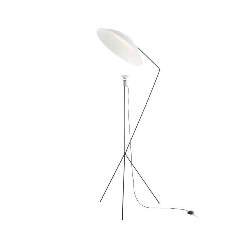 lampa podłogowa z odbłyśnikiem z repusowanej blachy stalowej w błyszczącym białym lakierze. klosz połączony jest z podstawą za pomocą magnesu, co umożliwia zmianę kąta nachylenia odbłyśnika. solidna podstawa rurowa (ø 10 mm) ze stali lakierowanej na czarno z czarnymi plastikowymi ślizgaczami