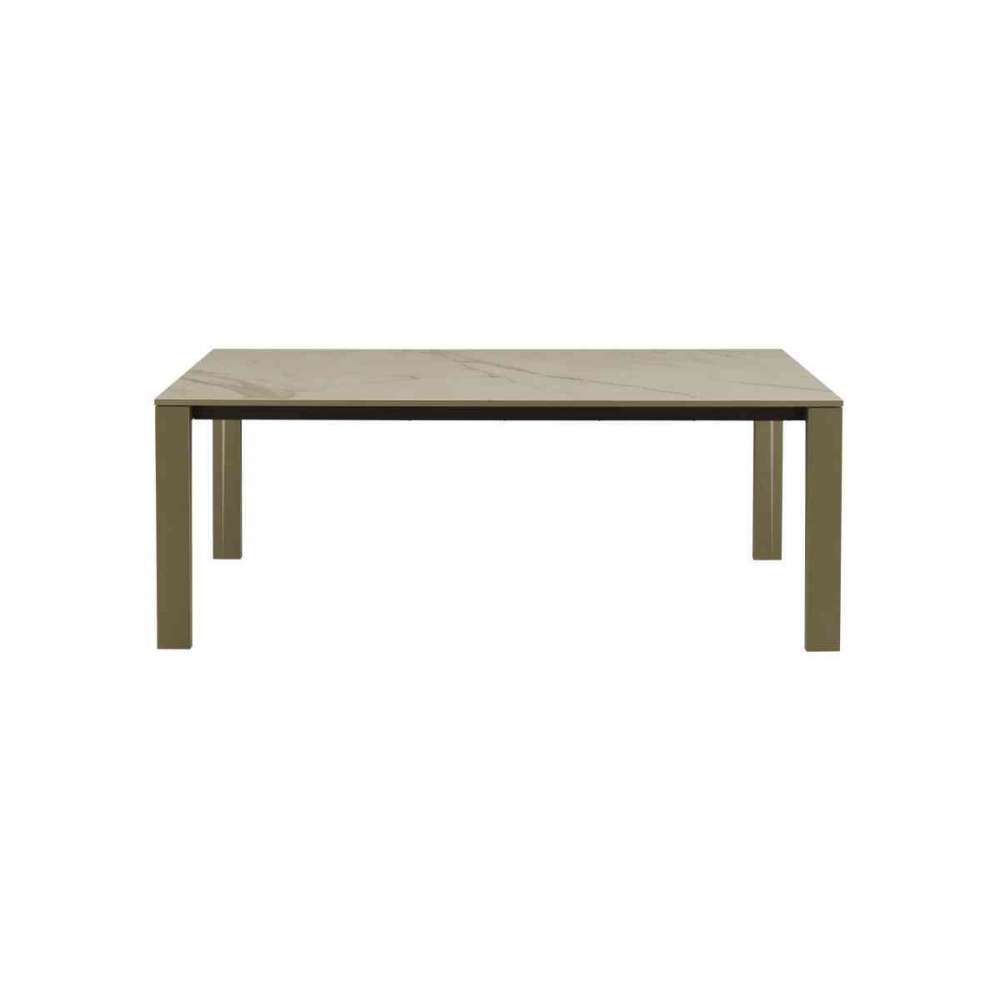 Wysokość 75cm Głębokość 100cm Szerokość 150cm Wysokość 29½" Głębokość 39¼" Szerokość 59" Nogi z kamionki ceramicznej Calacatta z dębu bejcowanego na brąz z białej kamionki Calacatta z efektem białego marmuru o grubości 3 mm, połączonej z płytą MDF o grubości 16 mm. Nadstawka jest dopasowana do blatu i jest ciągła (z marmurkowym motywem ciągłym na górze i przedłużeniu). Wykończenie Calacatta ma wygląd z żyłkowanego marmuru z żyłkami w odcieniach delikatnej zieleni i szarości na złamanym białym tle Blat jest z jednego kawałka: wystarczy pociągnąć za podstawę na jednym końcu, aby włączyć składane przedłużenie, które znajduje się na końcu stołu Podstawa wykonana jest z litego dębu z widocznymi głębokimi porami.