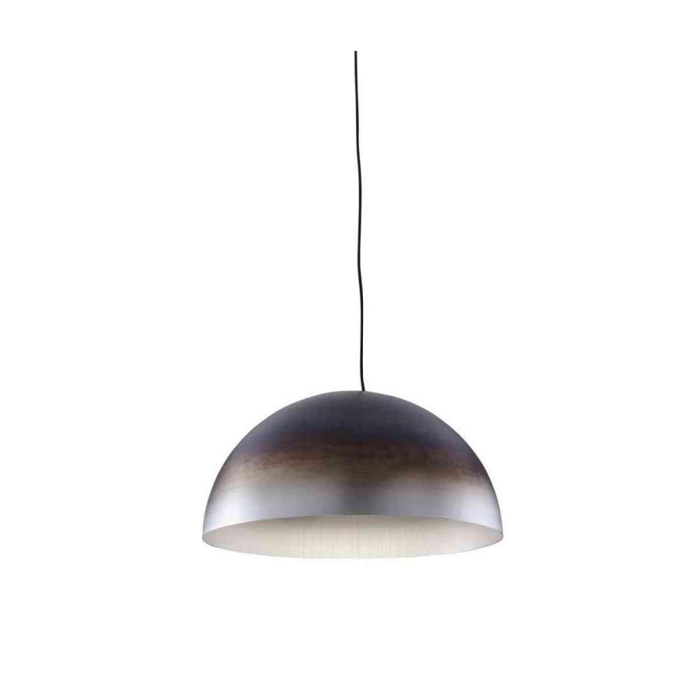 średnica 60 cm wysokość 336 cm średnica 23½" wysokość 132¼" półkulista lampa wisząca ze stali repusowanej, której wnętrze i strona zewnętrzna są wykończone opalizującym oksydowanym wykończeniem, z ochronną warstwą półmatowego przezroczystego lakieru epoksydowego