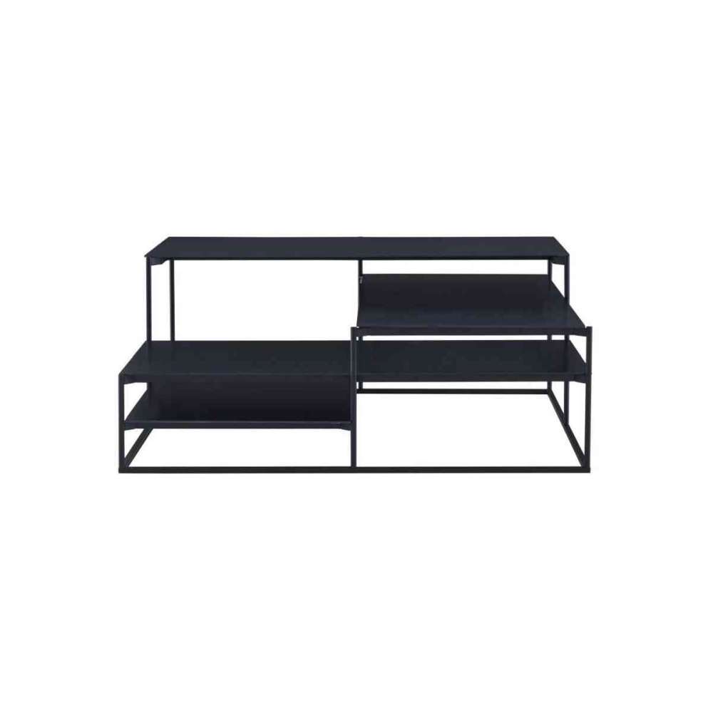 Niebieska stal jest uzyskiwana poprzez stopniowe podnoszenie jej temperatury. Gdy ochładza się w kontakcie z powietrzem, tworzy cienką warstwę galman, który zapewnia naturalną ochronę przed utlenianiem.Mała wersja ze stalową konstrukcją lakierowaną na czarno i blatami z oksydowanej stali.