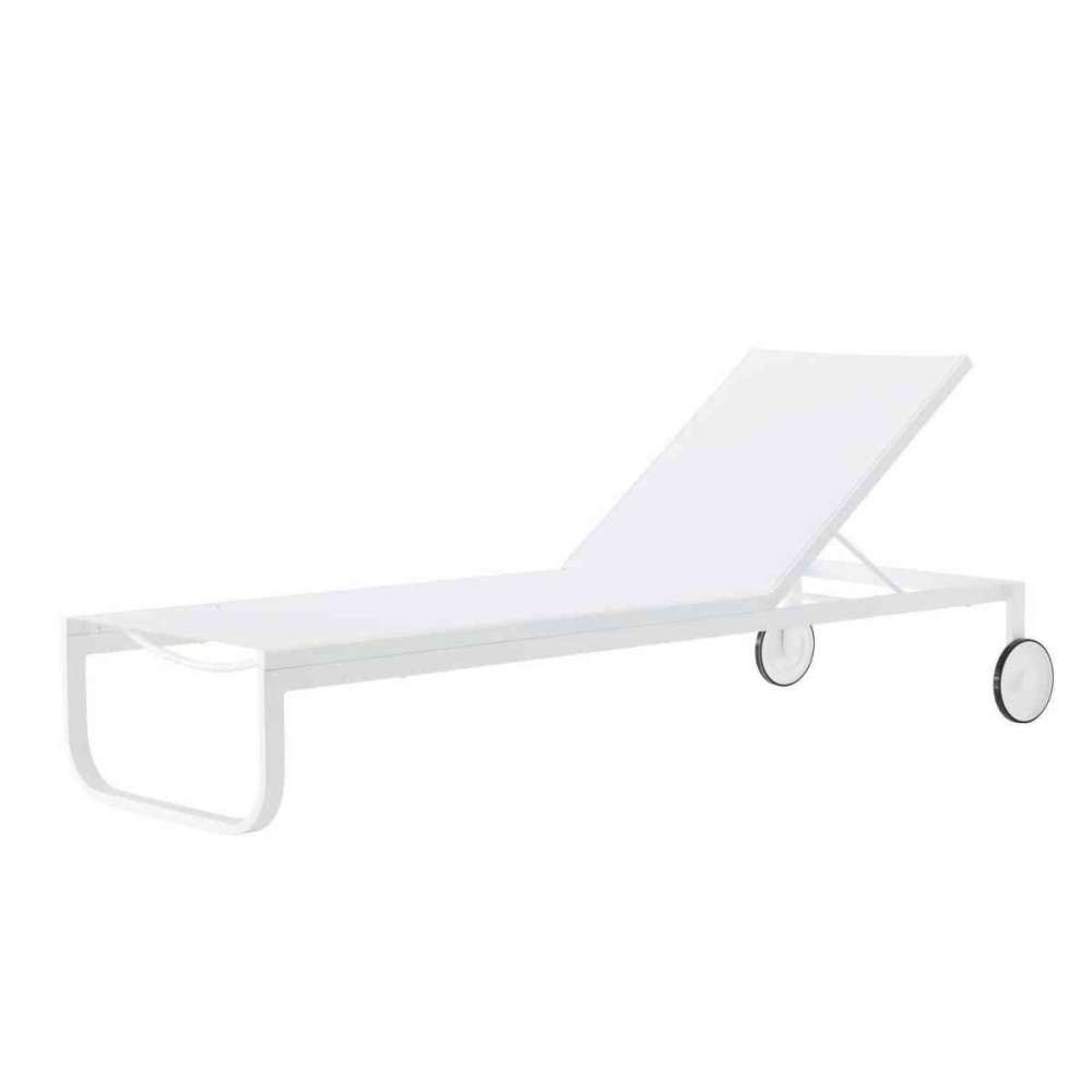 Leżak lettino łączy w sobie elegancki minimalizm konstrukcji ze stali lakierowanej na biało i aluminium lakierowanego na biało (oba poddane obróbce kataforetycznej) oraz komfort wysokiej jakości tkaniny outdoorowej (do wyboru blanc lub grège). ta elastyczna tkanina (75% poliwinyl / 25% poliester - 560 g/m²) jest zarówno trwała (jest zgrzewana termicznie), jak i łatwa w utrzymaniu (ponieważ można ją prać w wodzie z mydłem). wielopozycyjne regulowane oparcie umożliwia użytkownikowi spersonalizowanie oferowanego komfortu, od pozycji „siesta” do pozycji „do czytania” za pomocą 5-pozycyjnego systemu zębatkowego. dwa duże, atrakcyjne koła (ø 18 cm - z nylonu/poliuretanu + abs) przy wezgłowiu sprawiają, że lettino jest łatwe w przemieszczaniu, jednocześnie dodając odrobinę krągłości i miękkości do jego minimalistycznego wyglądu. funkcjonalny do samego końca, leżak Lettino można również ustawiać jeden na drugim. podane maksymalne wymiary obejmują koła i podniesiony tył. sama rama ma 70 cm szerokości i 196 cm długości. wysokość z opuszczonym oparciem 33 cm.