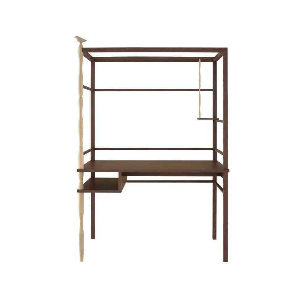 blat roboczy i półki z dopasowanej płyty mdf fornirowanej jesionem. dwie pionowe łodygi z toczonego litego jesionu z motywem dekoracyjnym