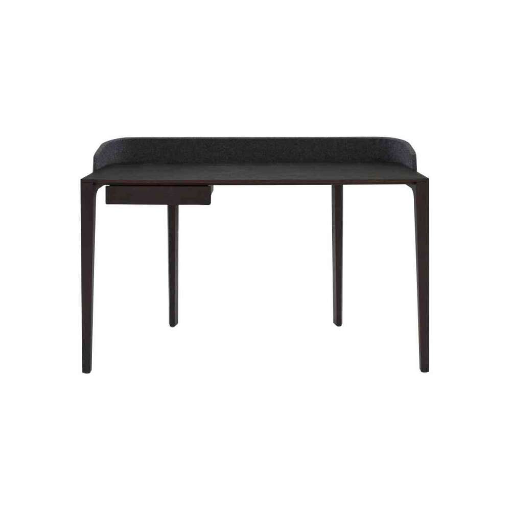 Podstawa z litego jesionu barwionego na antracyt, blat z litego dębu wykończony okleiną dębową barwioną na antracyt. tył biurka pokryty jest pianką i tapicerowany grafitem divina m180 (pokrowiec nie jest zdejmowany pomimo obecności zamka błyskawicznego). szuflada z litego dębu barwionego na antracyt z wnętrzem pokrytym divina grafit m180.